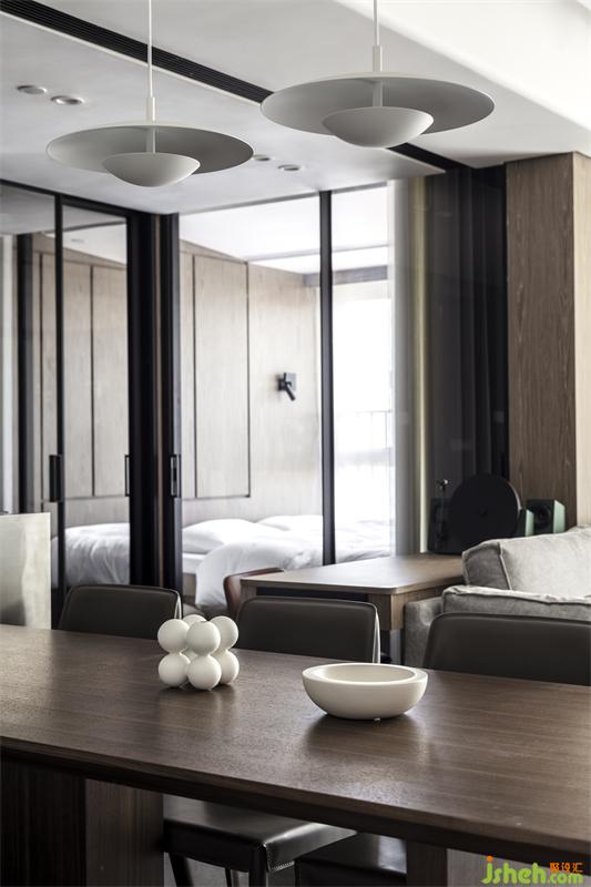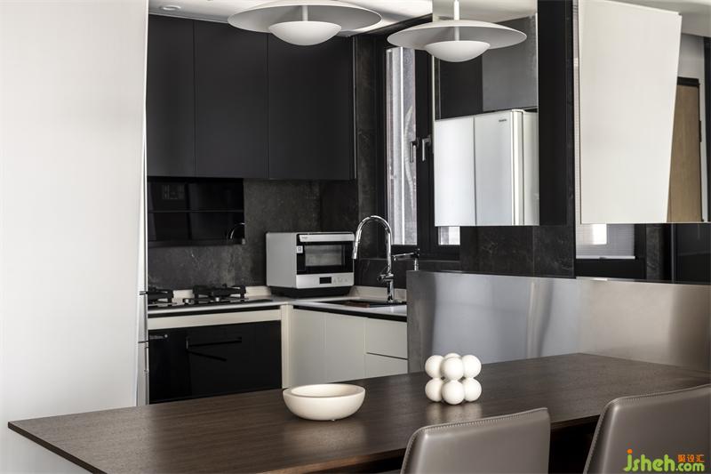 踏入餐廳,鏡子引光入室營造氛圍感,整體效果呈現(xiàn)一個深色炫酷的空間,展示了一系列令人驚訝的紋理和創(chuàng)意。
