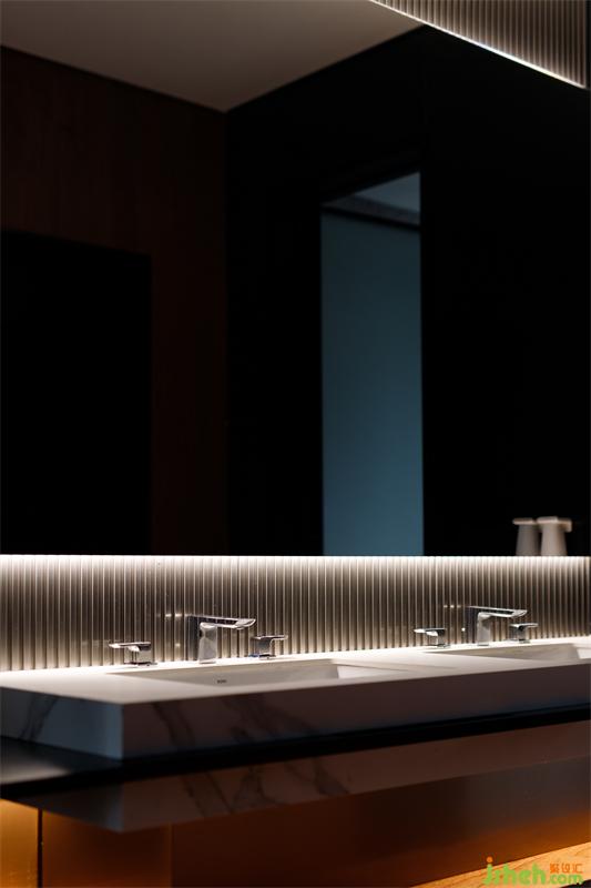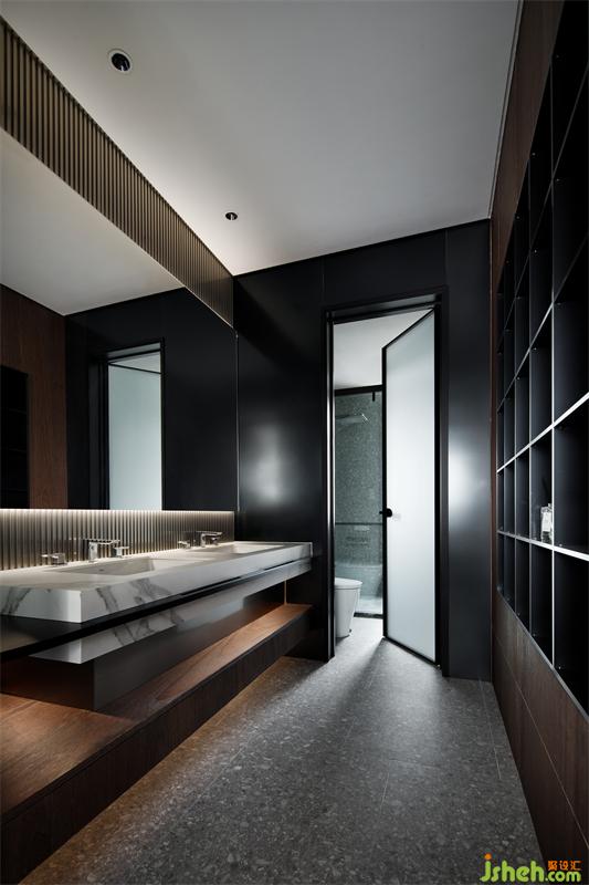 主衛(wèi)同樣使用反差的色調(diào),大面積地運(yùn)用鏡子以及不同的幾何造型,錯落有致地把空間的立體感呈現(xiàn)出來。