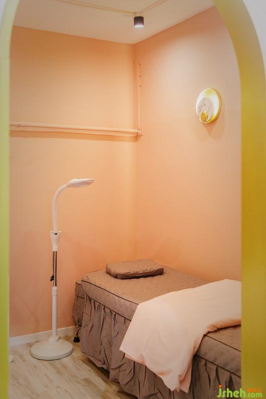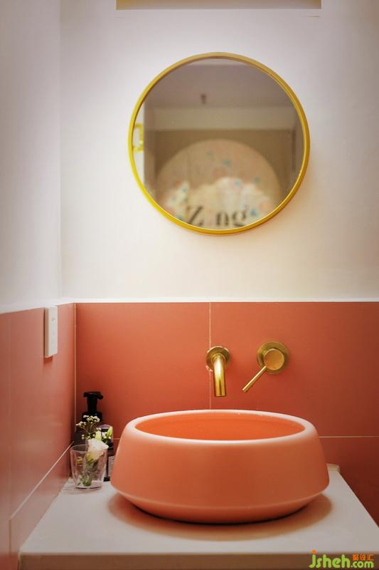 室內(nèi)采用圓形、半圓、凹陷和凸起等幾和形細(xì)節(jié),幾何形結(jié)構(gòu)為空間增加了層次感。顏色當(dāng)然是少女色啦,床的深棕色與之搭配,并沒有感覺到暗沉,反而是一直沉穩(wěn)舒適的感覺。衛(wèi)生間采用臺(tái)上盆,金屬質(zhì)感的水龍頭與橘粉色的臺(tái)盆搭配,制造少女情懷。