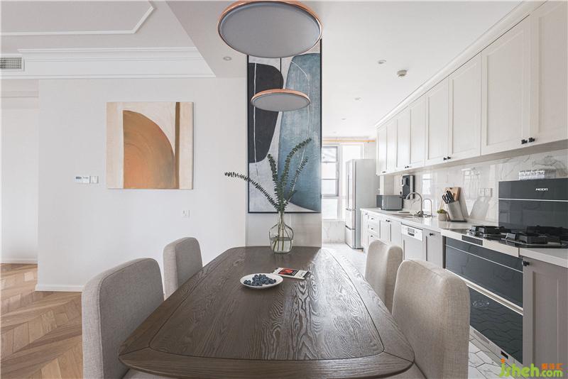 女主人很少下廚,我們將封閉式廚房改造成開放式廚房,一方面是為了打通與客廳之間的連接,讓整個空間顯得更大,另一方面由于客廳的空間狹小,加上餐廳會尤為狹窄,所以設(shè)計師將墻打掉,把餐桌放于客廳與廚房的交界處,并且用六邊形小白磚與木地板連接,顯得空間更有層次感為其一,其二,開放式的布局可以一邊做菜一邊和家人朋友聊天,和大家分享原材料是怎么被加工成美食的這個過程,這非常重要。