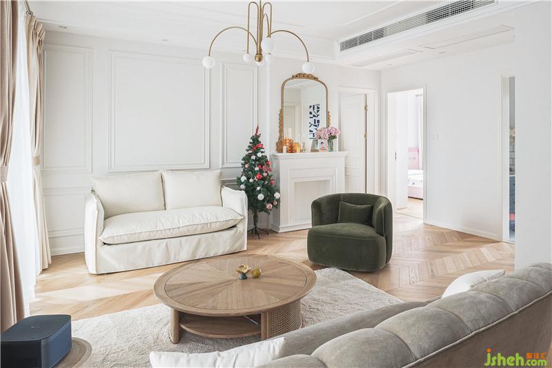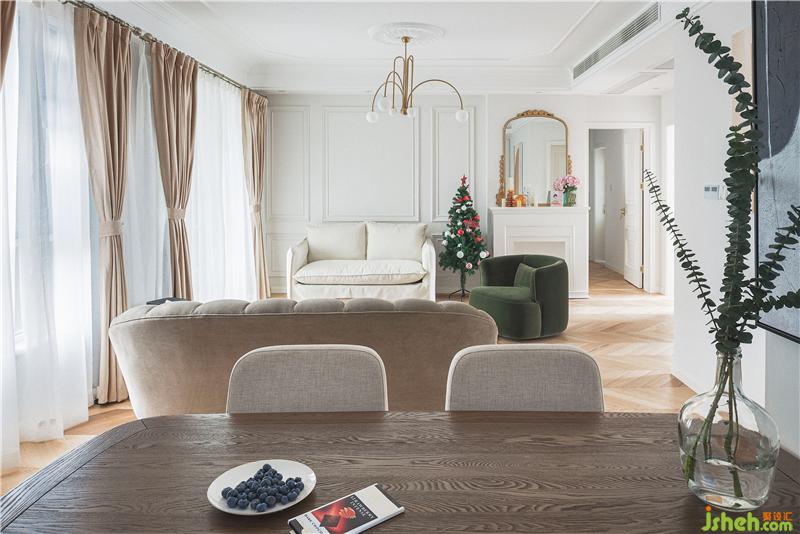 入戶后,客廳餐廳以及廚房的部分一攬入云,整體擴大了視野,由于業(yè)主很喜歡壁爐,所以設(shè)計師在考慮了壁爐之后,便沒有增加電視墻,考慮后期會加入投影儀,于是設(shè)計師將壁爐放于右側(cè),貼墻設(shè)計。為避免旁邊顯得空落,設(shè)計師在臨壁爐旁,放置雙人沙發(fā),相互呼應(yīng)。家具尺寸選的相對袖珍三人沙發(fā)、雙人沙發(fā)和單人沙發(fā)的錯落搭配,加上諾大的雙排大窗,讓整個空間視覺在原有的基礎(chǔ)上擴大化。