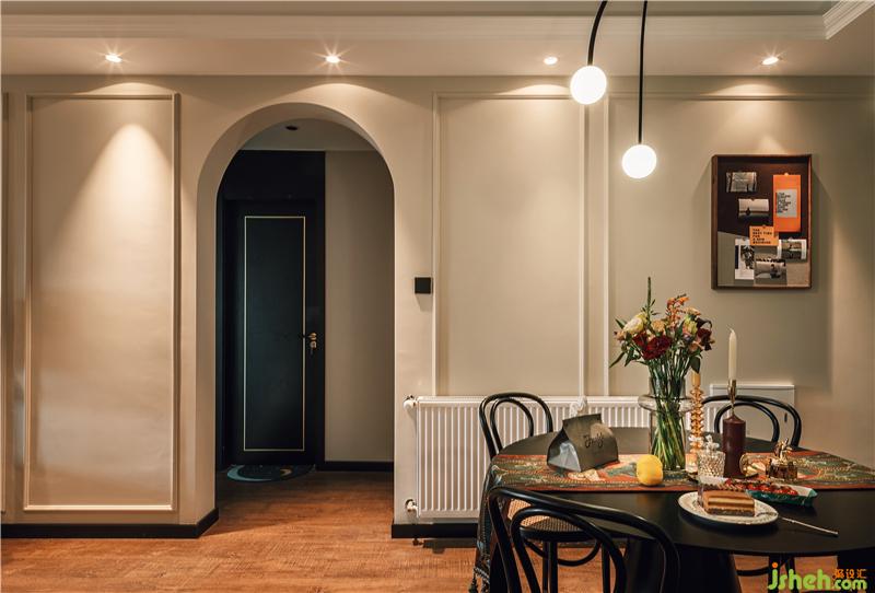 以復(fù)古的石膏盤搭配弧形吊燈,將無主燈客廳與餐廳相區(qū)分,簡約的黑色圓桌與藤編椅,與餐桌上的燭臺(tái)、花束、桌旗等搭配相得益彰。餐廳處設(shè)有一電表箱,用以可開合的裝飾畫所覆蓋,畫上貼有夫妻倆行走過足跡照片,整個(gè)餐廳的氛圍都變得溫暖且有格調(diào)。裝修設(shè)計(jì)