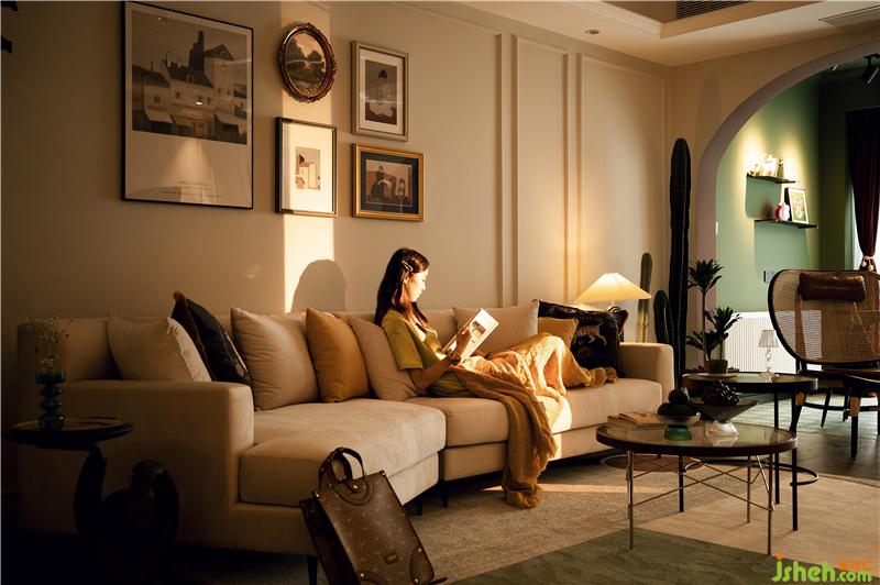 無主燈設(shè)計(jì),使客廳空間更開闊,墻面以白色為主,添加了石膏線,增添了房屋的立體感。所有地面均采用木地板,比地磚會(huì)更有溫度,客廳異形沙發(fā)與室內(nèi)植物相連接,讓整個(gè)空間更具有生機(jī),也有屏風(fēng)隔斷的作用。陽光穿過落地窗灑入屋內(nèi),與一盞懷舊復(fù)古的落地小臺(tái)燈微弱的光,交相輝映。這斑駁的光影,靈動(dòng)且恬靜,讓家具與藝術(shù)品的結(jié)合更加出彩。