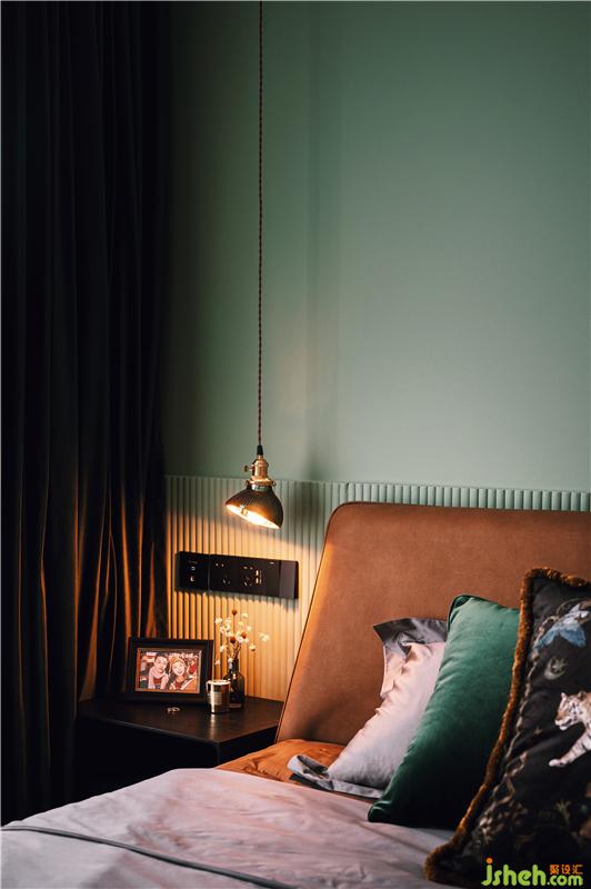 墨綠色的臥室背墻配半墻石膏線(xiàn),使其墻面有立體感不單調(diào),墻上懸掛的復(fù)古壁燈仿佛帶來(lái)了上個(gè)世紀(jì)的復(fù)古華麗,與一旁磚紅色的床頭和墨綠色絲絨窗簾相搭配,溫暖又舒適,素色被單與虎頭抱枕,給臥室又增加了層次感,使得臥室充滿(mǎn)韻味。