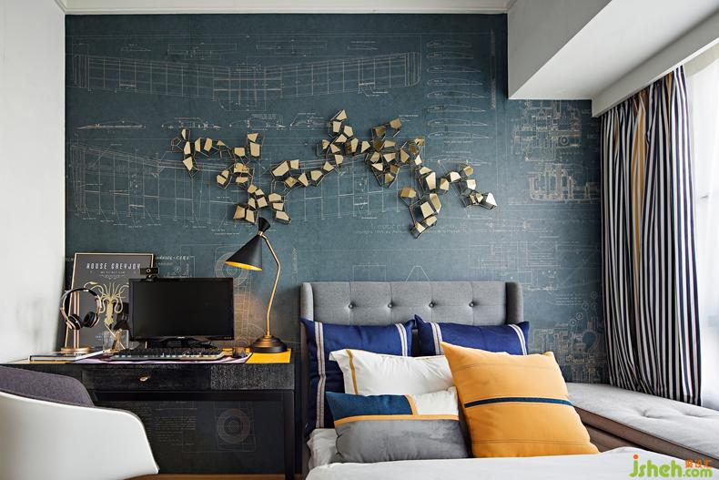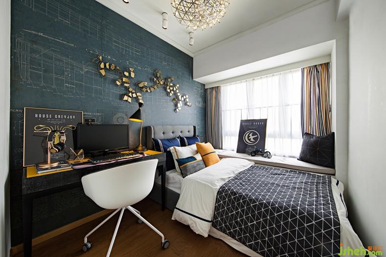 男孩房一整面設(shè)計(jì)別致的墻紙,打破大塊白墻面的單調(diào)感,長條形書桌滿足功能需求,自然光線充滿室內(nèi),深圳設(shè)計(jì)公司使得空間在色彩的明度和硬度方面非常柔和一致,整體呈現(xiàn)低調(diào)奢華又個(gè)性十足的空間氛圍。