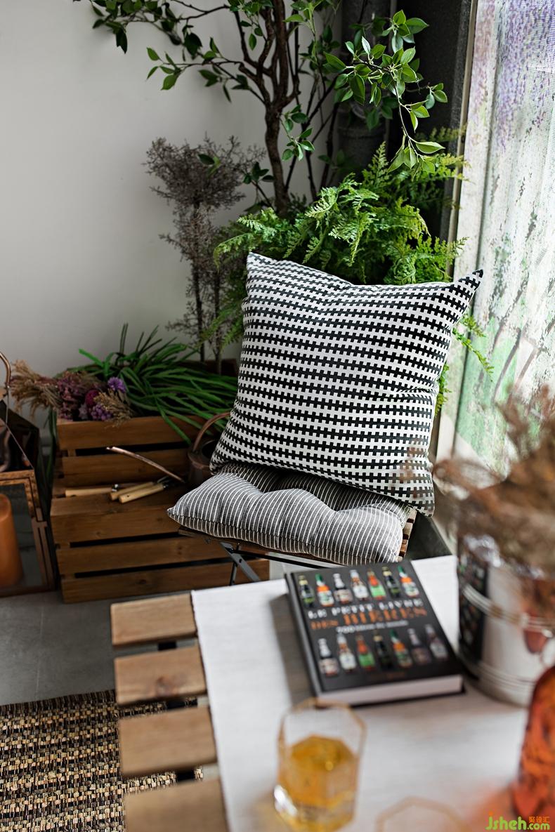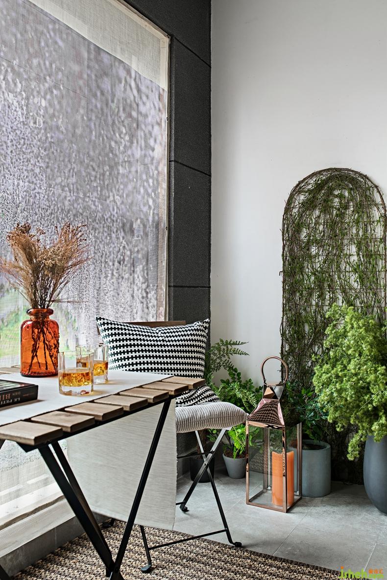景觀陽臺(tái)假日風(fēng)情休閑桌加軟包墊座椅,在這里可以更接近自然風(fēng)景,有生機(jī)盎然的綠植與陶藝花瓶、木質(zhì)坐凳給人以自然干凈的視覺效果,在此觀景小憩,讓人心情舒暢。