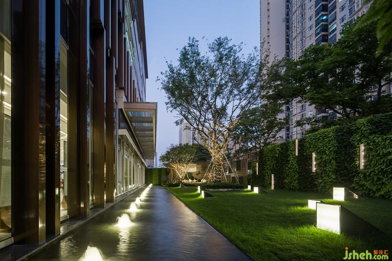 連綿的地景,搭配輪廓分明的音樂草地?zé)?,設(shè)計(jì)公司通過這些簡(jiǎn)單而微妙的關(guān)聯(lián),與整體設(shè)計(jì)元素相呼應(yīng)。綠植墻的設(shè)計(jì)讓綠在立面上得以延續(xù),塑造出了空間的多維層次感。