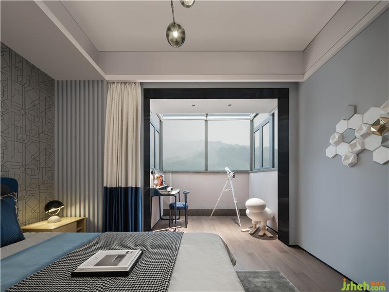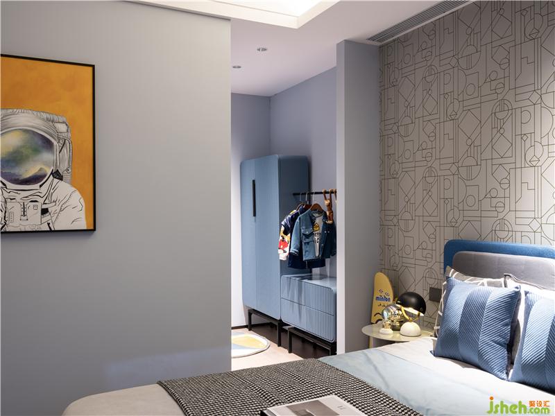 男孩房的色彩跳脫于整體空間的灰藍,采用充滿活力的天空藍和動感黃做為跳色,通過豐富的飾品:天文望遠鏡、星空主題吊燈、卡通版宇航員擺件、滑雪板道具等策劃出一場精彩的探險之旅,滿足小男孩勇敢冒險的天性。