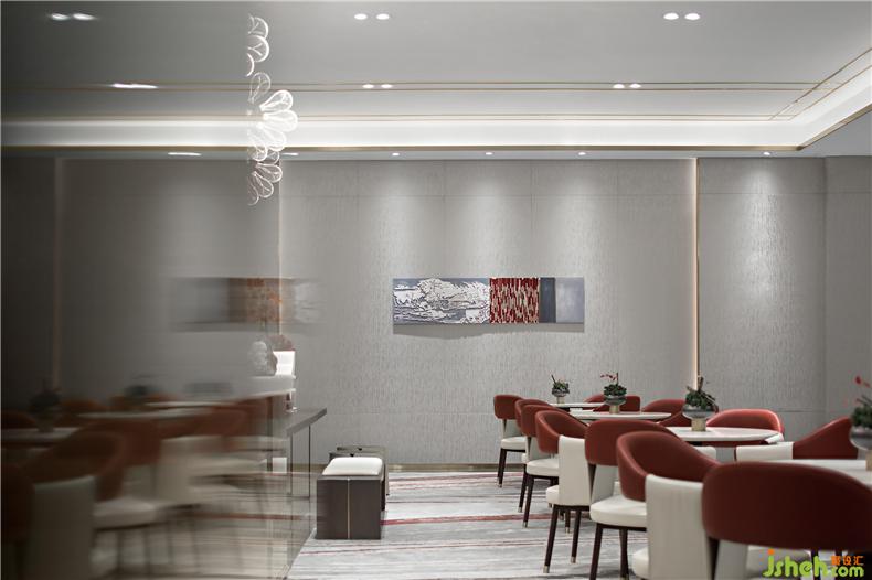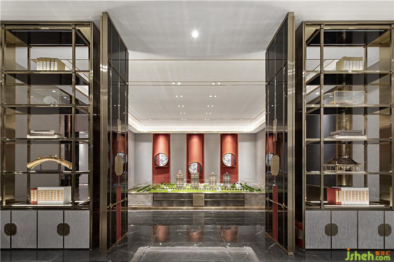 一處建筑的表現張力往往從公共空間開始,黑灰色調襯托著鎏金色度的優(yōu)雅,方正開闊的空間秩序鋪陳著儒雅的敘事邏輯,移步亦趨的旱景作品鋪設出古韻的藏墨畫卷,讓空間遐帶一隅夢回之境,對話中式美學的謐靜。