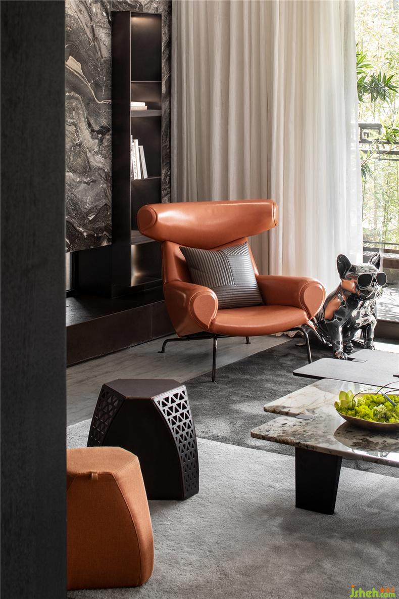 大理石、木紋肌理、皮質(zhì)、分別呈現(xiàn)出硬、中性、軟,以及冷、中、暖的質(zhì)感,空間內(nèi)三種材質(zhì)的碰撞出“剛?cè)岵钡姆諊凇吧菥印敝须[喻精致,在“簡居”中勾勒活力。