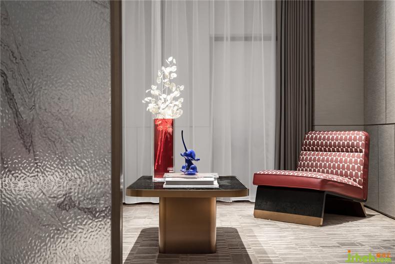 簽約室 丨紅藍(lán)的碰撞在原本沉穩(wěn)華美的空間里跳躍,金屬與燈光的映照提供一個使人沉浸和愉悅的氛圍,售樓處裝修設(shè)計使得我們的眼睛和所有的感官被誘醒,去形成一個從進(jìn)入開始的完整的體驗感。