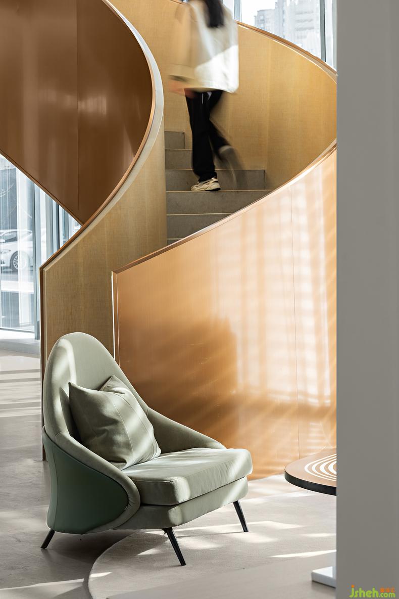 旋轉(zhuǎn) 丨結(jié)構(gòu)與視角構(gòu)成“各種各樣的空間”,光影經(jīng)由玻璃投下自由的舞蹈,裝修設(shè)計灑在金色的樓壁上,不可名狀、不予置評,如此甚好。