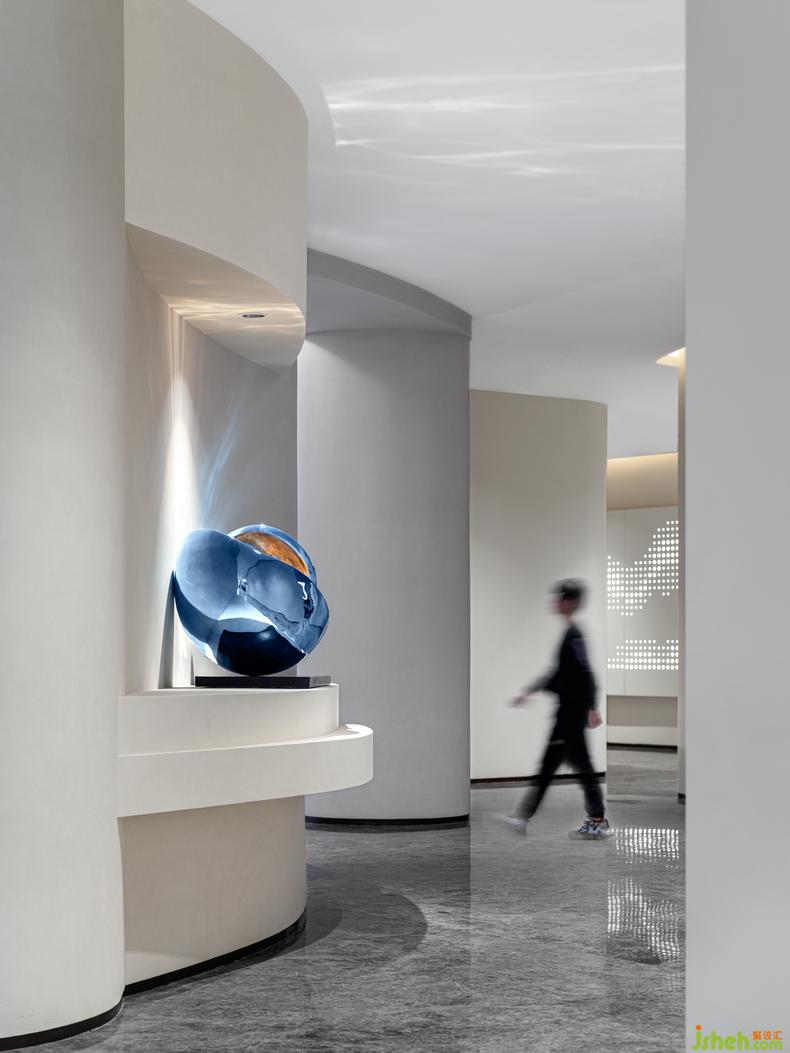 走廊丨 動線的流通總是可以成為契機(jī),來激發(fā)更多能量的釋放,室內(nèi)設(shè)計師一處流線波紋的創(chuàng)意靈感,透過視野的角度呈現(xiàn)自由的變幻,自身的蔚藍(lán)的光影配合光源的反射,讓體驗(yàn)更加豐富、真實(shí)和多元。