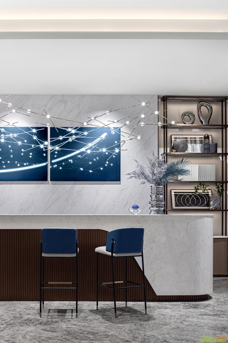 水吧區(qū)丨 重組和煥新式空間敘事梳理流線的關(guān)鍵,室內(nèi)設(shè)計師水吧空間的剛?cè)嵬瑯?gòu)讓視野更加聚合,明快的浩瀚藍(lán)勾描著未來的體驗(yàn)感,豐富交織的縱貫頂燈,彼此疊置融合,串聯(lián)交互,更衍生出序列的體驗(yàn)感,讓寰宇滲透進(jìn)可塑的空間體量中。
