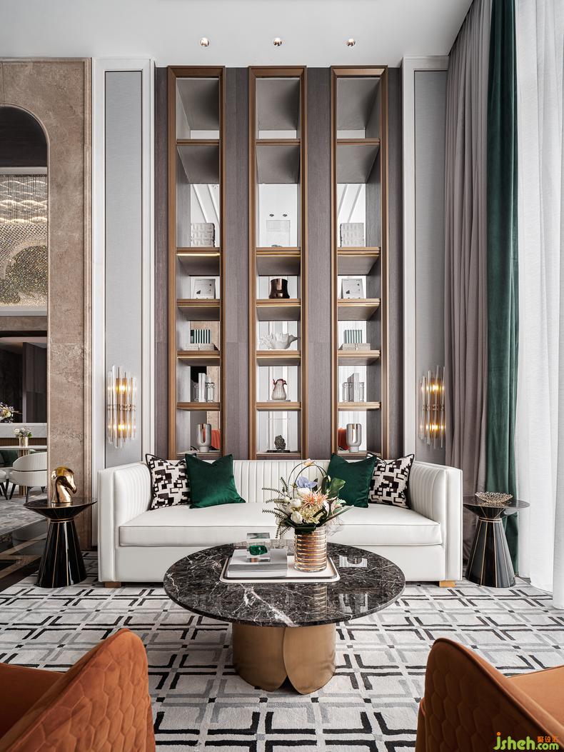 中廳洽談區(qū)丨 不刻意挑戰(zhàn)前衛(wèi)創(chuàng)新,也不流于趨勢(shì)隨風(fēng)擺動(dòng),室內(nèi)設(shè)計(jì)師開闊明敞的理性訴求架構(gòu)規(guī)整,而色彩則為其注入了感性的脈絡(luò),猶如珠寶洽談區(qū)的溝通方式,半圍合的形式給予洽談序列,縱橫對(duì)稱的審美語(yǔ)言讓空間敘事精致典雅。