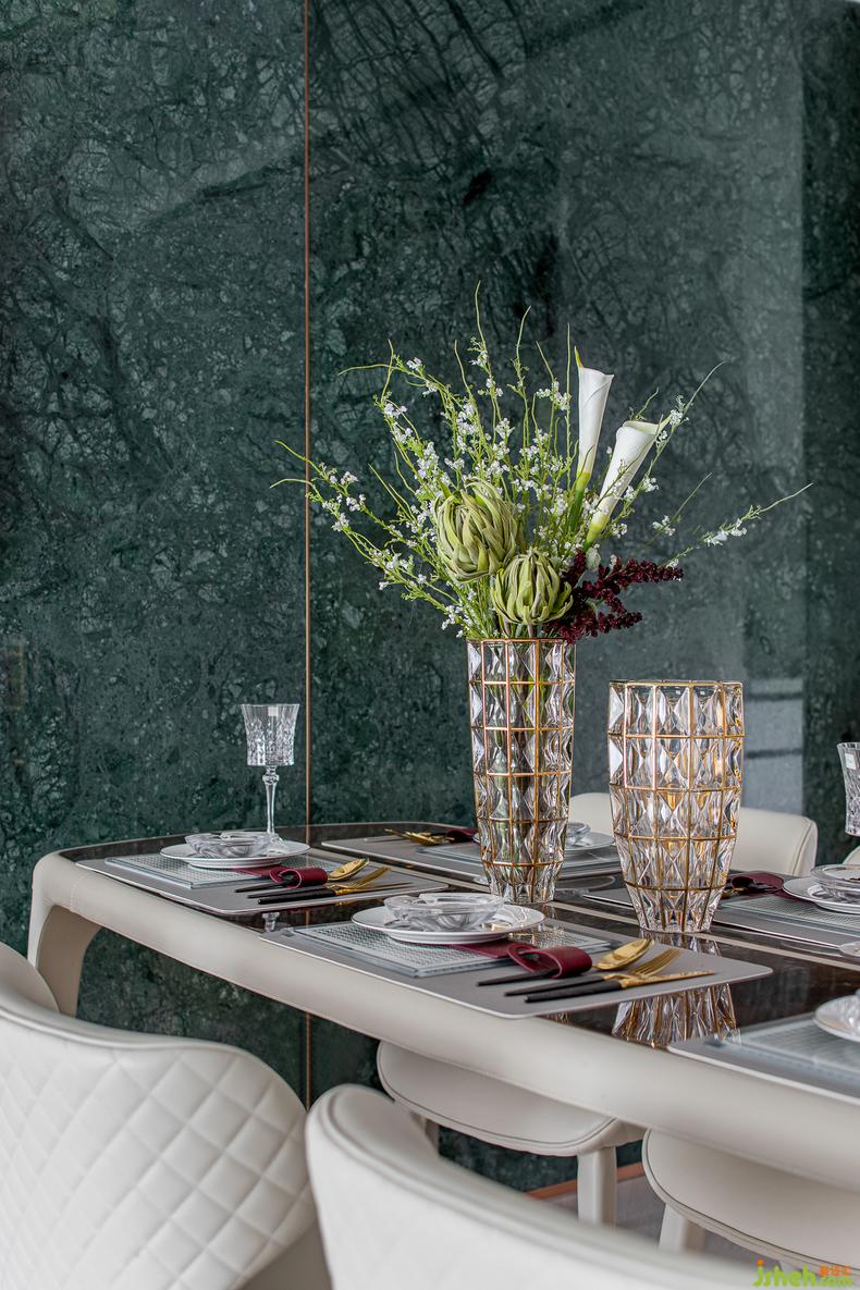 對于餐廳氛圍的設計,采用了體驗與深度的融合,室內(nèi)設計師含蓄內(nèi)斂的寶石綠給人以生機盎然的自然靈動,搭配鎏金配色的頂燈、杯皿、餐具,讓就餐擁有極盡絢爛的樸素和張揚驕矜的氣質(zhì)。