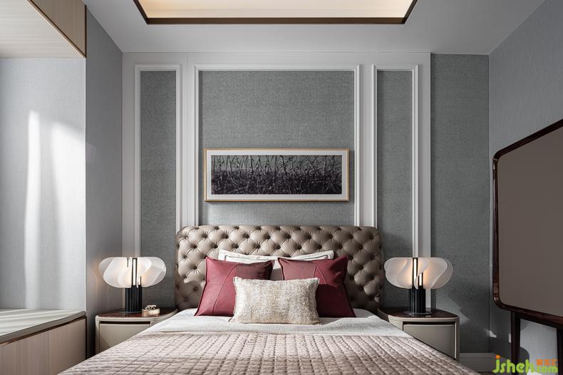 素色的墻紙與富有肌理的墻布相結合,斜型格紋的床頭框線呈現(xiàn)著最精確的視覺比例,室內(nèi)設計師再搭配絲絨酒紅的色彩點睛,讓起居的場景在舒適和諧之上,演繹著尊貴奢華的生活體驗,沉穩(wěn)大氣,格調(diào)高雅。