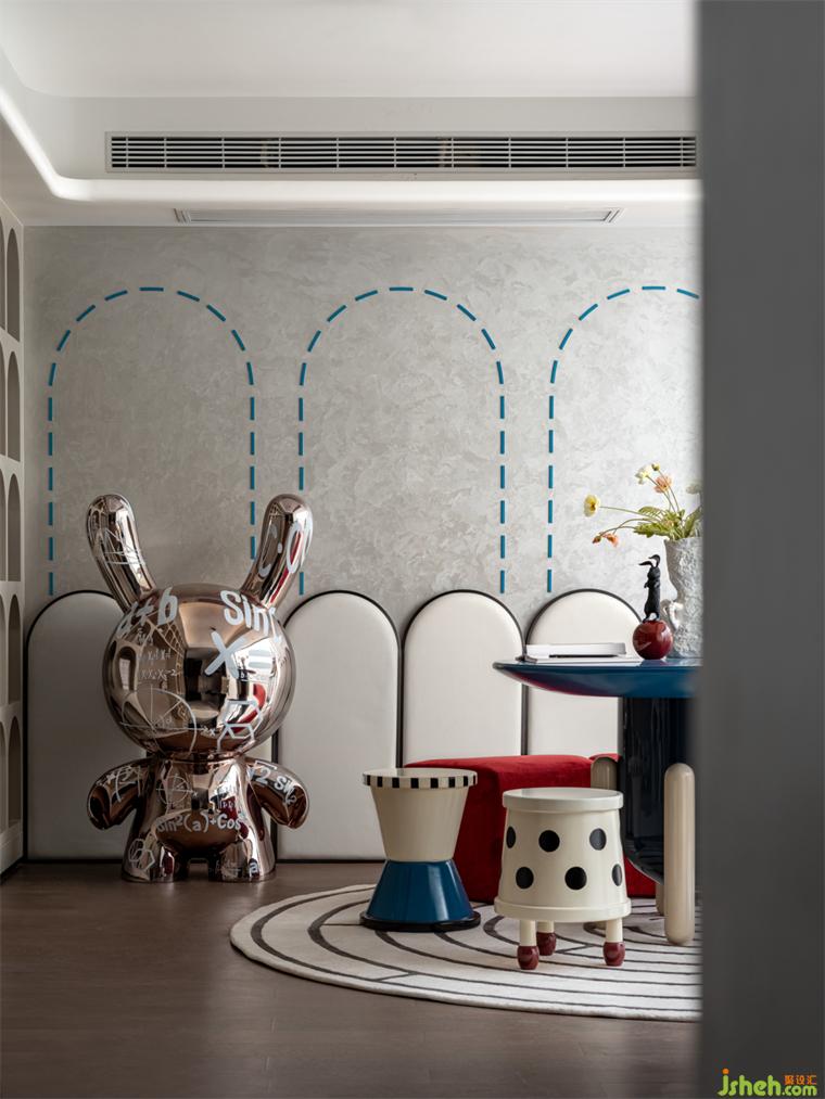 娛樂(lè)室丨這是家中孩子的舒適區(qū),撞色的‘象型家具’(以自然元素造型設(shè)計(jì)的家具)顯得更具生活感與童趣,墻邊的軟包既起到了裝飾的作用也增添了美感;整面拱形元素的柜體借喻童話的美好,樣板房設(shè)計(jì)整個(gè)空間讓孩子們可以暢玩想象。