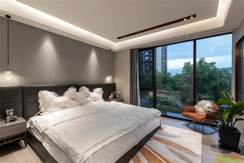 臥室的落地窗將大片美景擁入懷中,好比一副巨幅水墨,隨晝夜變幻。