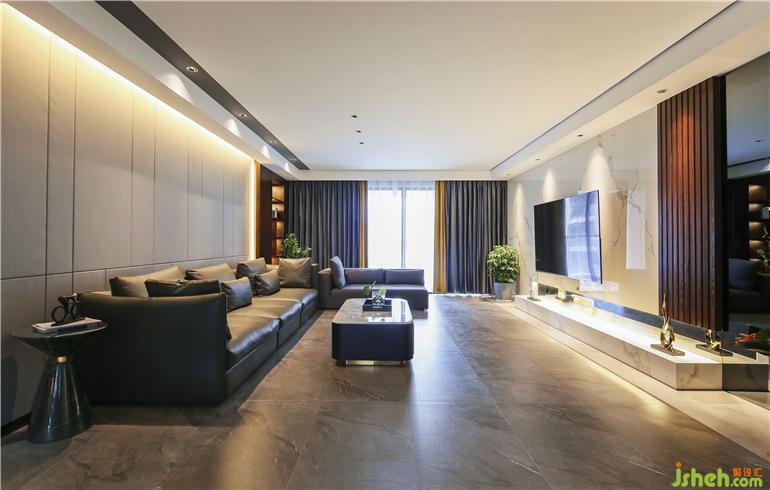 客廳在布置上比較簡潔,電視背景墻以白、咖兩色為墻面主要顏色,地面用質(zhì)感極強的深色瓷磚,展現(xiàn)港式的前衛(wèi)時尚。