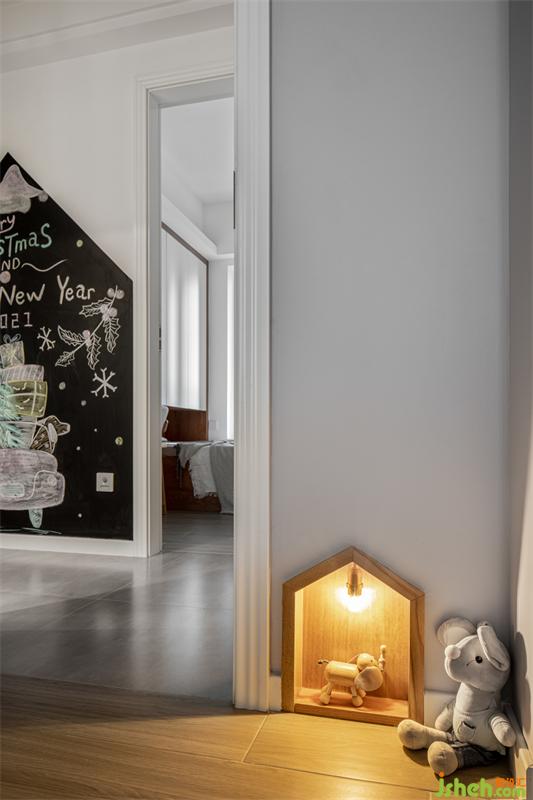 作為孩子的專屬活動空間,兒童房不是一個空間,更是一段獨一無二的時光,是承載著整個童年回憶的地方,門邊的屋子腳燈守護著孩子的童趣。