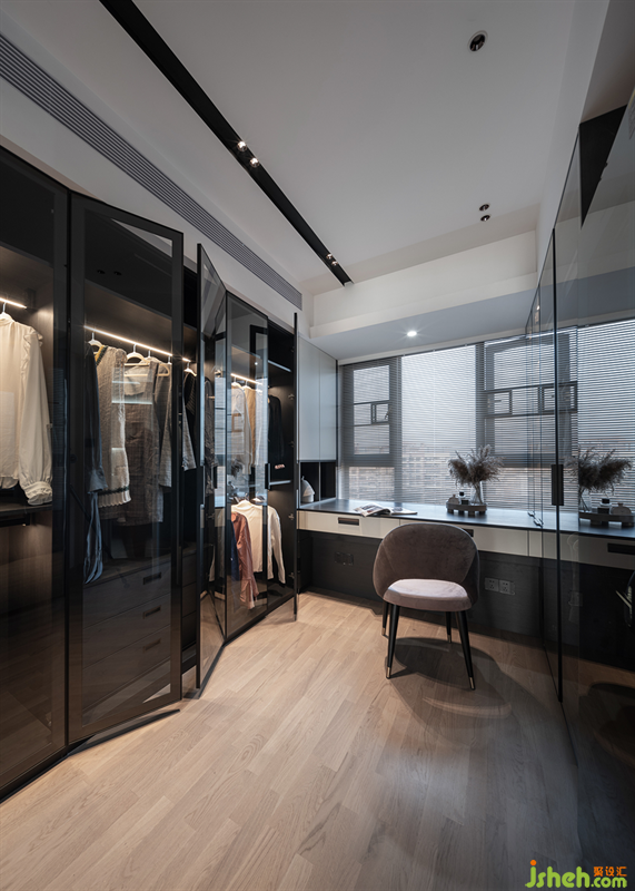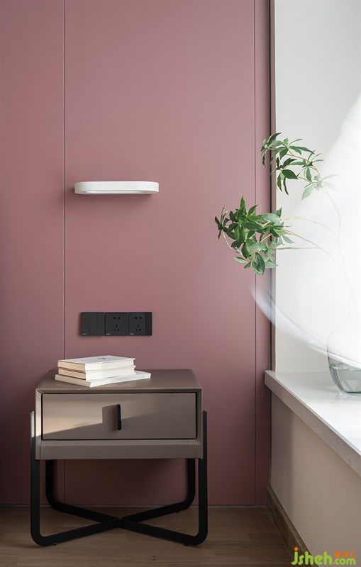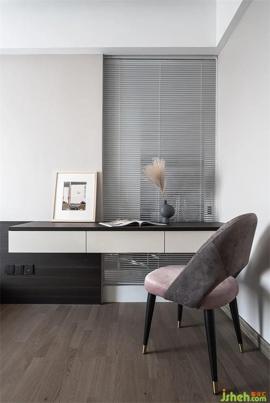 黑白色系的梳妝臺(tái)與精心挑選的粉色麂皮座椅搭配組合,凸顯冷靜自持與柔情浪漫,烘托與眾不同的空間氛圍。