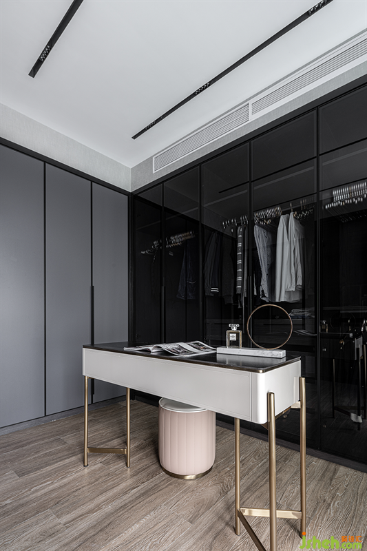 一整片衣帽間,整齊條理地陳列擺放衣物。一抹粉色暗示著女主人即將來臨。