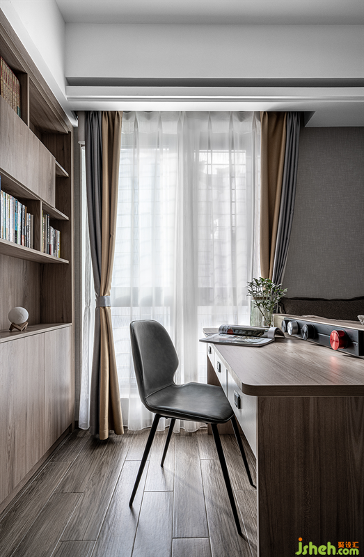 窗臺(tái)的處理兼顧了晾曬和閱讀的功能性。墻面鋪貼飾面板與墻布,寬窄相間的比例線條讓空間有律動(dòng)的節(jié)奏感。