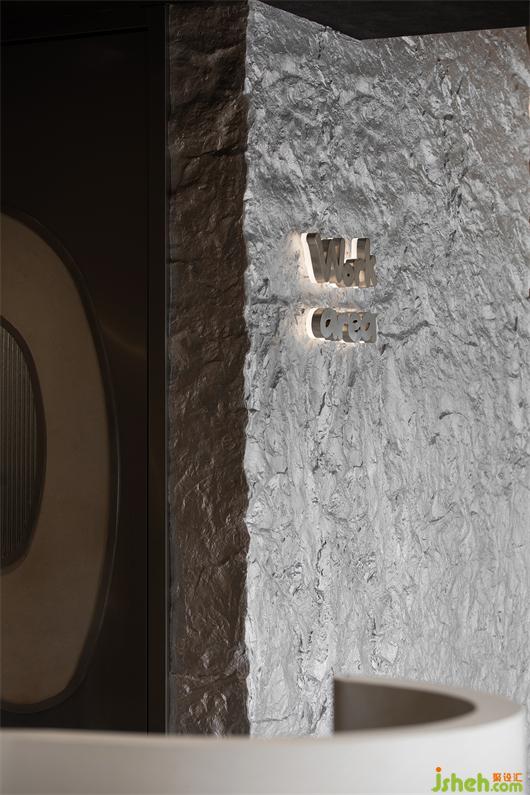 出品區(qū)的漸變墻體還原出山谷的質(zhì)樸拙意,光與影的介入打破了單一色調(diào)帶來的沉悶,在間接光源的暈染下,巖石表面立體觸感的肌理,伴隨著不銹鋼臺面折射出的粼粼波瀾,粗獷中裹挾著微妙細(xì)膩感,賦予來客心靈回歸自然的生命氣息。