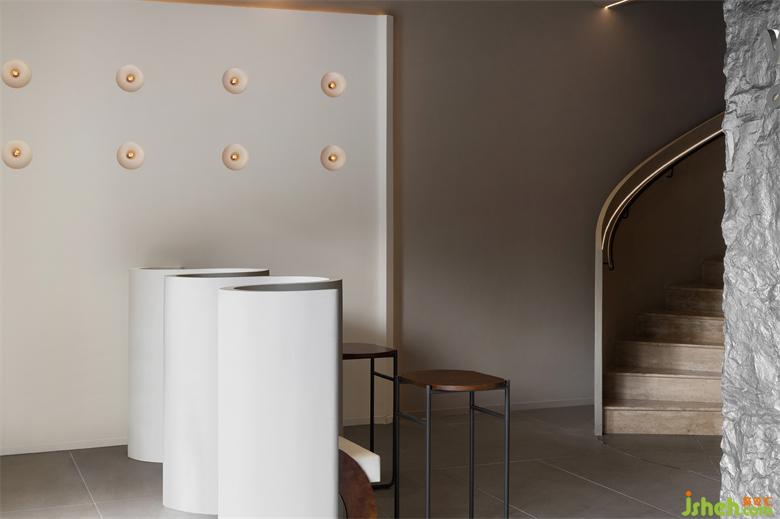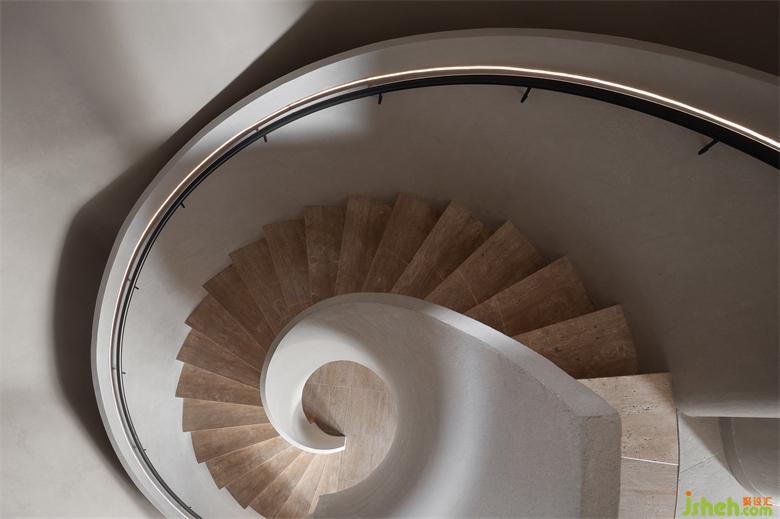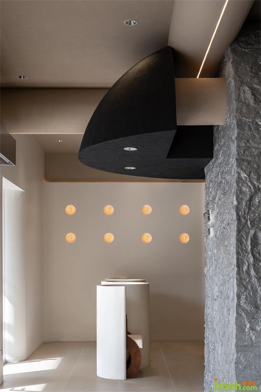 順著旋轉(zhuǎn)樓梯拾級而上,建筑內(nèi)不規(guī)則造型的洞穴、連接梁和弧形墻是設(shè)計師尋找語匯回應(yīng)自然召喚的實踐,CoCo設(shè)計形成了一步一景的場景畫面感,也讓空間平添了幾分關(guān)于未來感的隱喻。
