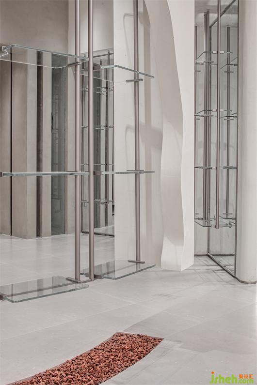 穿過GB手作包展區(qū),服飾陳列區(qū)的天花延續(xù)了前廳流暢順滑的線條,有秩散落的主副光源均呈飽滿的圓形,柔化了空間不規(guī)則外緣帶來的邊界感,同時使產(chǎn)品本身成為唯一的焦點,自然而然地將消費者的目光吸引到中央的飾品展柜及四周的服飾陳列架上來。地面裝飾及展架也同樣保有一定的曲度,既能中和大量的金屬材質(zhì)帶來的視覺冷感,又可以與天花遙相呼應,藉由多樣的線條將不規(guī)則空間“化零為整”。
