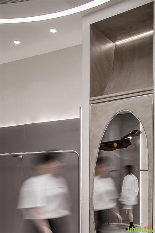 室內(nèi)借由線面、體塊以及色度上的調(diào)和,奠定清爽簡練的空間氛圍,買手店設計在遞進與交互之間詮釋出靈動的層次之美。圓與方、曲與直、明與暗的拿捏思考,貫穿整個空間,微妙的平衡打破了棱角分明的常規(guī)邏輯,又從動態(tài)上將每個功能分區(qū)彼此連接。