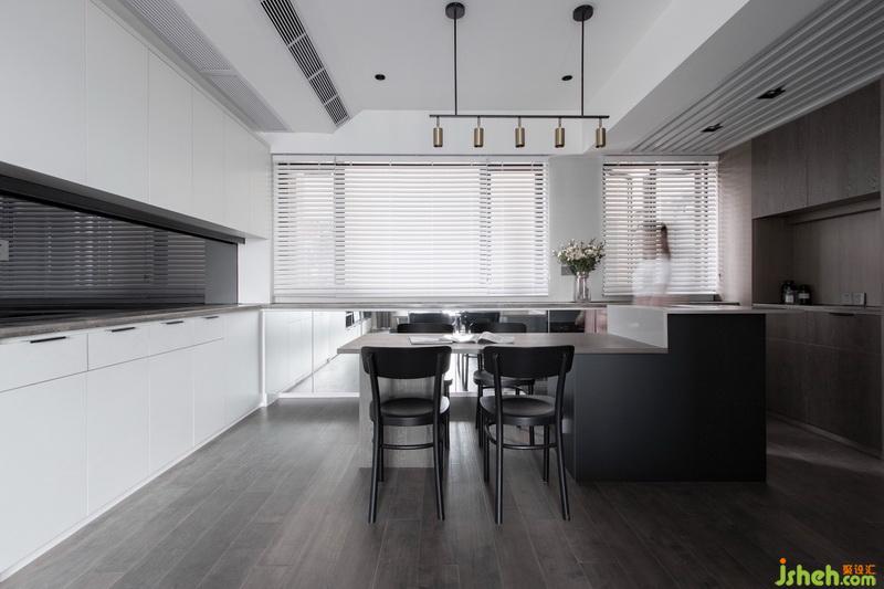 餐廳有著寬闊靈動(dòng)的環(huán)形動(dòng)線。中島臺(tái)設(shè)置了烤箱和電磁爐,方便女業(yè)主進(jìn)行簡(jiǎn)單的煮食和制作糕點(diǎn),這無(wú)形中也延伸了廚房的區(qū)域。墻面上,從靠近玄關(guān)并與其呼應(yīng)的深色木面柜體、到窗戶下明亮的鏡面柜體、再到與電視墻一體成形的白色柜體,三者提供了非常充足的收納空間,各自的材質(zhì)使用分工明確而又能自然地過渡。