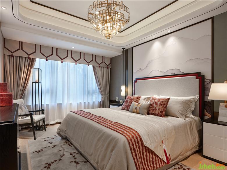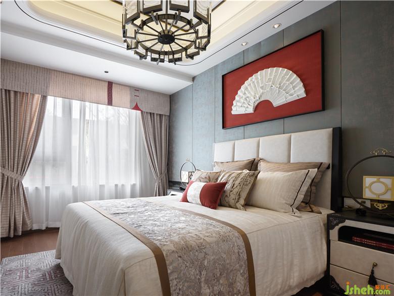 而臥室空間窗簾與床品顏色的互相輝映,突出詩意畫境。吊頂加以黑色線條過渡空間層次,