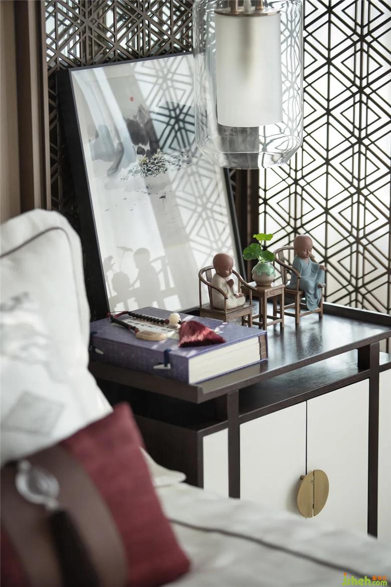 行至起居室,歲月刻于門窗欞飾上,座椅、瓷具、書卷等在形制上樣板房設(shè)計(jì)采用古雅今情的表達(dá),考量充分的美學(xué)性,細(xì)微的閑情逸趣被寫入床頭內(nèi),清雅山水畫卷后,實(shí)為移門屏風(fēng),推開即書房,清雋別致間,渲染大隱于市的棲居生活