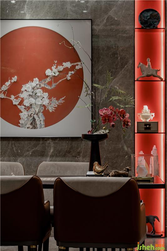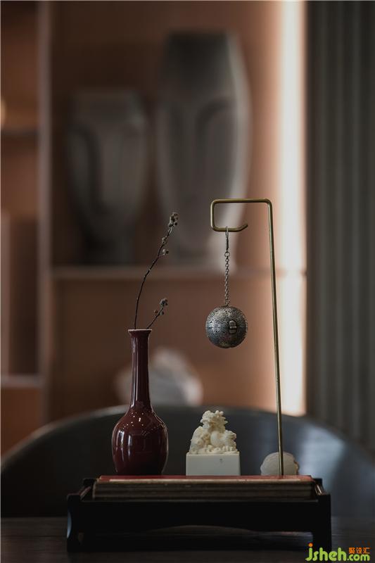 負一層,紅藍色的跳色,加入整個空間,顯得生動有活力,更具有藏品室的氣質(zhì)。會看花的人,就會看云、看月、看星辰,并且在人世中的一切看到智慧。當習習晚風、夜幕穹頂,選擇沐浴更衣、焚香靜讀,在這樣一處同樣雅韻備至的空間,顯露自己的優(yōu)雅情致、表達著對生活的衷心虔誠。