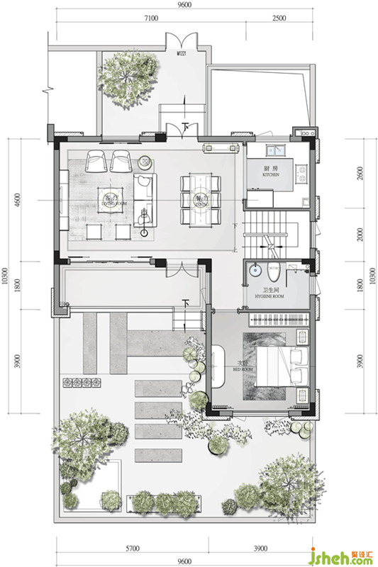 炎炎夏日,室外綠樹如蓋,知了喧天,室內(nèi)溫情敝屣。下沉式庭院并無其他物體填充,做減法的設(shè)計在滿足功能的同時兼具視線所及的美感,單一套座椅,便能滿足居住者休閑的需求。