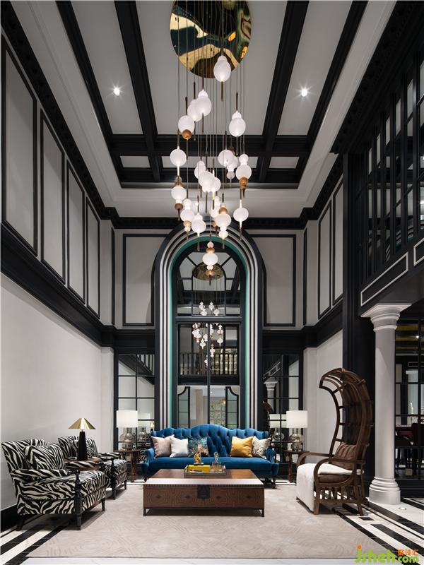 進(jìn)入party區(qū),超挑高法式拱門勾勒大廳的敞闊感,空間恰到好處的線條點(diǎn)綴,產(chǎn)生新與舊的對(duì)話。休閑區(qū)實(shí)用性必不可少,party區(qū)一側(cè)細(xì)致地安排了酒吧區(qū)及酒窖,大面積的黑色搭配,為空間投下一道重彩。