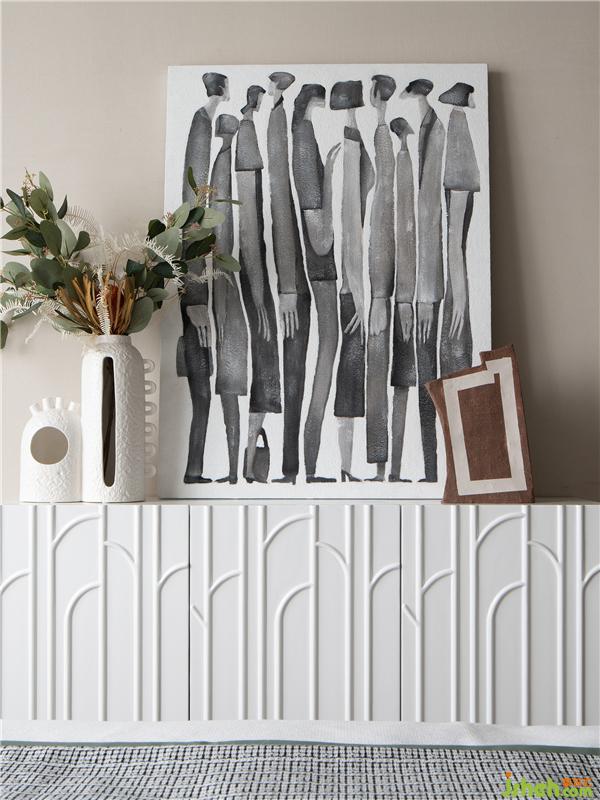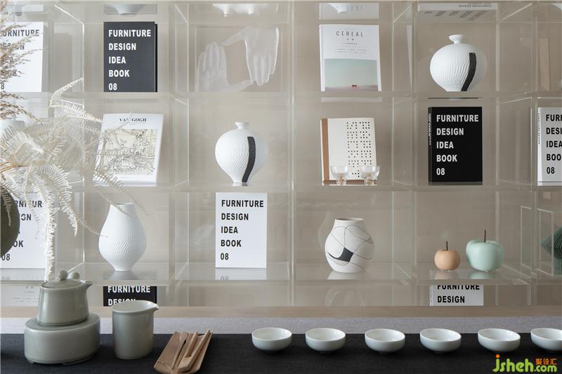 這里還陳列著主人愛(ài)好的抽象藝術(shù)畫(huà)作,調(diào)皮的小貓、連續(xù)的水平線條理性而優(yōu)雅,具有強(qiáng)烈的秩序感。入戶右邊的茶室,充滿了儀式感,樣板間軟裝設(shè)計(jì)透明的置物架在陽(yáng)光下散發(fā)著熠熠的小光芒,那些看似平凡尋常的小器物擺放在一起,給觀看者提供了喚醒給予世界另種解釋可能性的機(jī)會(huì)。同時(shí),空間又可根據(jù)使用者,功能變化,可以是直播工作間,客房,書(shū)房,花房等等承載生活。