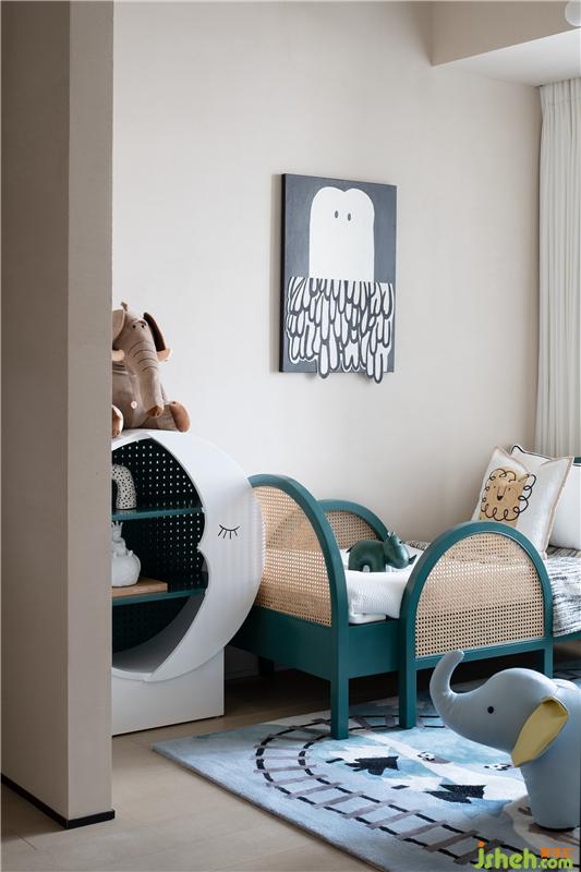 為營(yíng)造自由、靈動(dòng)的成長(zhǎng)空間,不限制兒童的活動(dòng)和想象力,樣板間軟裝設(shè)計(jì)以叢林冒險(xiǎn)為主題,可愛(ài)的兒童床與玩偶來(lái)豐富空間的藝術(shù)性與趣味性,落地式月亮收納柜,一切都盡可能地靠近兒童身份特征與天性。