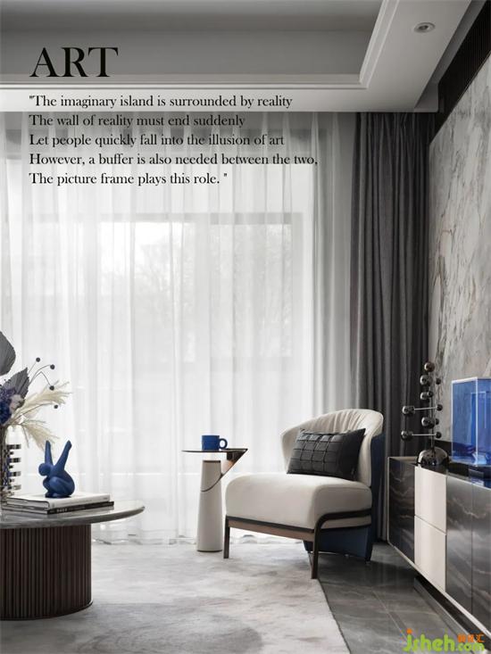 在本案項(xiàng)目里,整個(gè)空間是讓人能夠注視藝術(shù)的畫框,樣板房設(shè)計(jì)大海即是畫框中的藝術(shù)品。