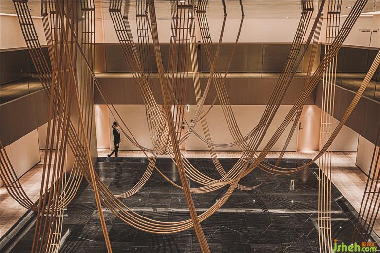 每?jī)蓪涌头慷家肓穗p高中央庭院。一個(gè)反射性的湖面,竹制的舞蹈曲線自然落下,仿佛在空中漂浮著云朵。這種天花板懸掛結(jié)構(gòu)再次與竹編織大師協(xié)商如何利用其自然彈性和傳統(tǒng)連接方法創(chuàng)建曲線。到達(dá)房間前,客人會(huì)感覺(jué)像穿過(guò)一片抽象的竹林。
