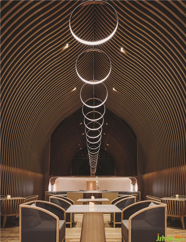 在頂樓的SkyCafé,全高的竹子結(jié)構(gòu)構(gòu)成了禪宗和教堂般的空間。上方的天窗可以讓白天的自然光落在座位區(qū)的中間。商務(wù)酒店設(shè)計(jì)吊頂懸掛的圓形LED燈形成無(wú)盡的發(fā)光月亮,并在夜間為客人提供詩(shī)意的體驗(yàn)。