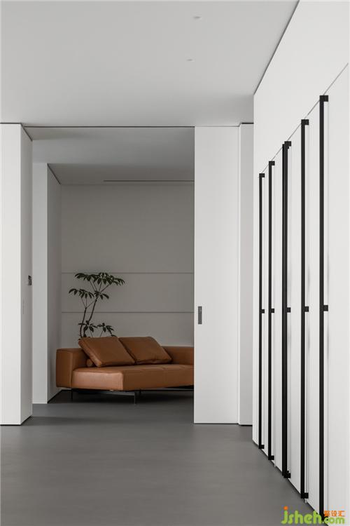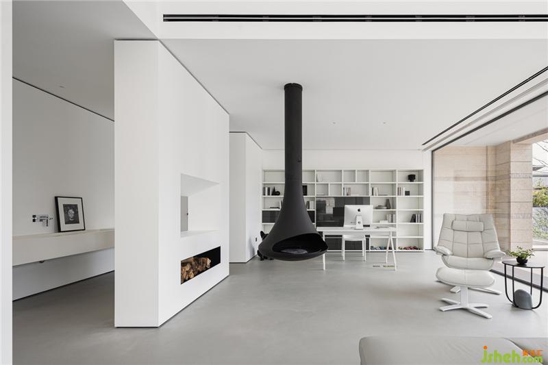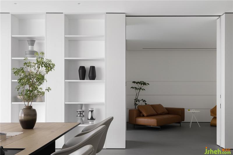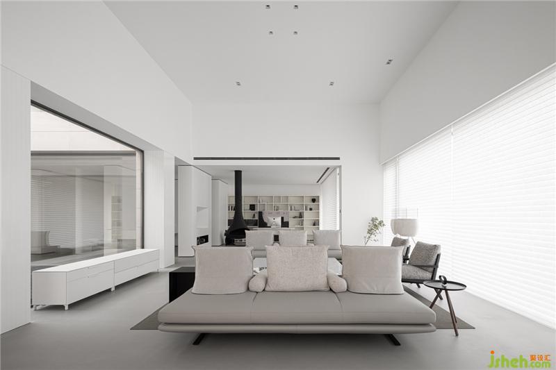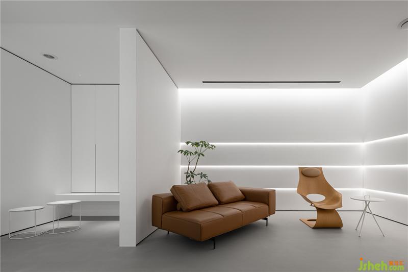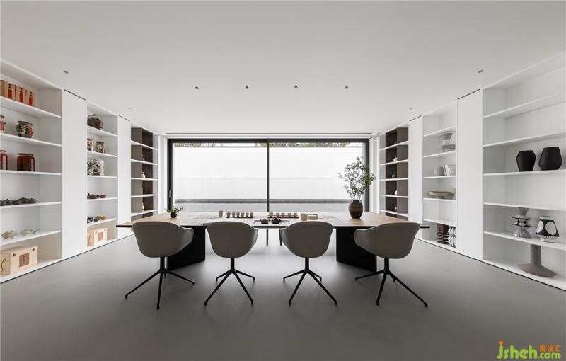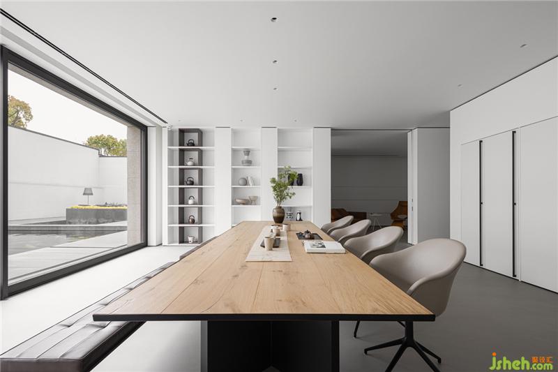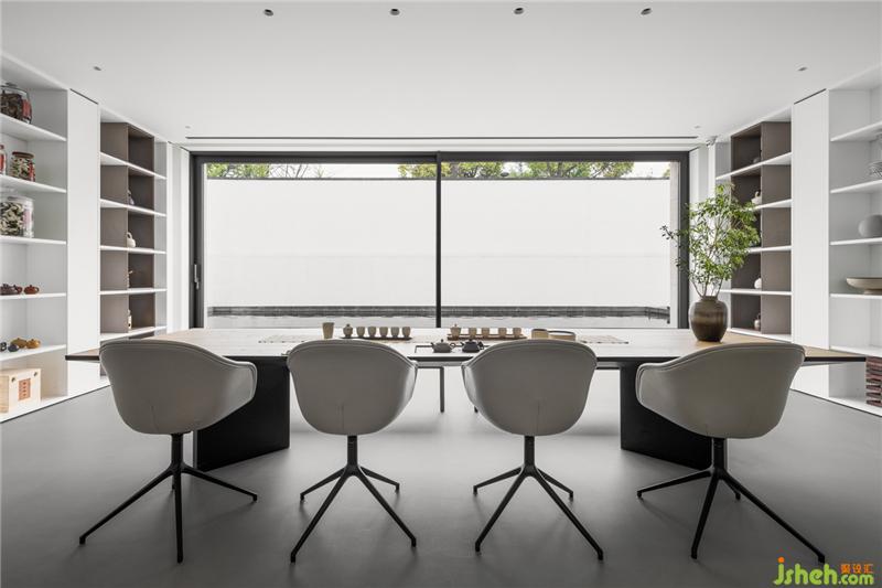 在色彩裝飾層面,拒絕花俏,用最簡單清新的色彩和造型來裝飾空間。茶室與庭院,用玻璃墻分割,不僅延伸了室內(nèi)空間,還將自然與空間融為一體。