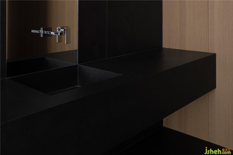 木質(zhì)隔門分割兩個(gè)空間,營造兩種截然不同的使用感受,臥室是優(yōu)雅的純白,與之截然相反的是冷暗色調(diào)盥洗室,充盈著高貴亮眼的黑蘇州別墅裝飾。