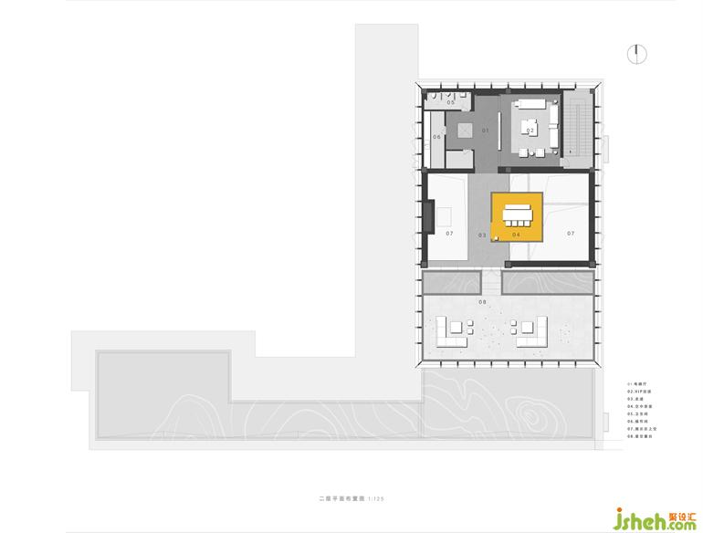 與?斯洛的需求層次模型相契合,在下部兩層滿足了歸屬、尊重等需求后,南京會(huì)所設(shè)計(jì)頂層承擔(dān)了建筑最終的自我實(shí)現(xiàn)。藝術(shù)展廳中心上空,橙色的休憩室以極其注目的方式出挑。作為建筑群體意識(shí)的頂點(diǎn),這顆跳動(dòng)的“心臟”與屋面景觀攜手造就空間中樞,向四周輻射能量。氣息上, 出于對空間?色的轉(zhuǎn)變的適應(yīng),本次南京會(huì)所設(shè)計(jì)嘗試通過細(xì)部構(gòu)造、軟裝飾品的精細(xì)調(diào)整,塑造由 底部裝飾感向頂部雕塑感的轉(zhuǎn)變。