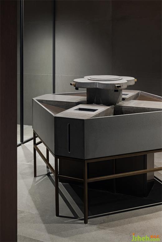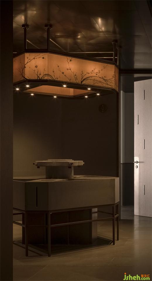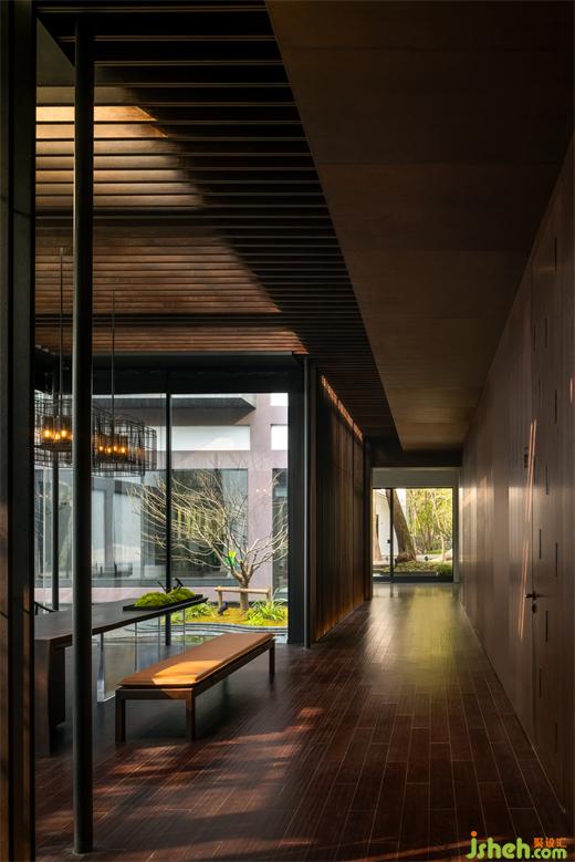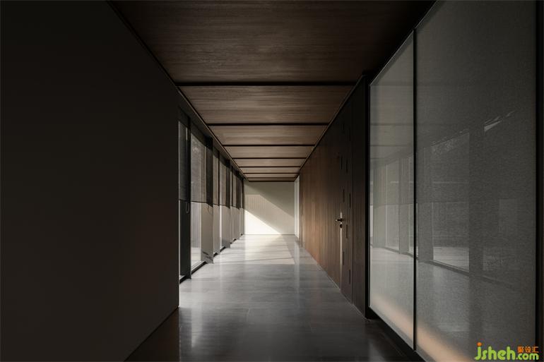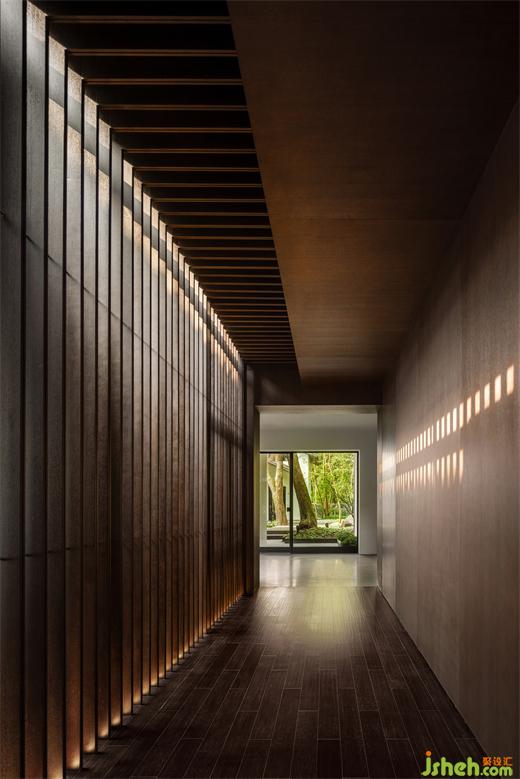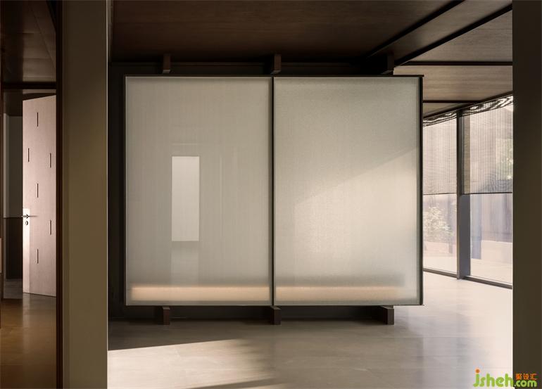 經(jīng)過(guò)陣列式的柱廊,有亭躍然水面,由四根纖細(xì)的柱體支撐,應(yīng)用抽象化的思維表達(dá),南京會(huì)所設(shè)計(jì)使亭脫離水面又與蕩起的漣漪產(chǎn)生互動(dòng)。坐于亭中,三面玻璃通透,輕薄的和紙依附其上,光線的穿透被削弱,微風(fēng)浮動(dòng),竹影斑駁,穿堂而過(guò)的風(fēng)聲,帶走門廳給人的厚重,實(shí)現(xiàn)了對(duì)偶空間的輕盈。