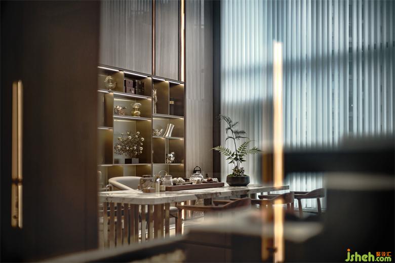 順著玄關步入茶室區(qū)域,與陽臺共通,大面積落地窗讓整個空間被窗外的自然光線所浸透。室內(nèi)頂部及相應柜體為相互呼應的顏色,用線條感帶動整個空間的靈動性,柜子與電視嵌入墻面更顯高級感。家裝設計在茶室設計中,推拉門的元素是對茶室構成要素進行再設計,以此展示不同以往的新中式茶室風采。