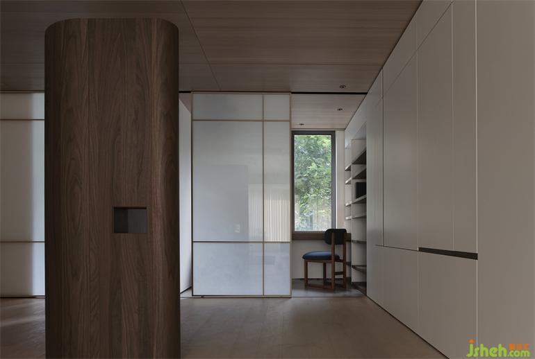 一間相對(duì)個(gè)人化的書(shū)房,移開(kāi)屏風(fēng)就與家中最開(kāi)放的空間合二為一,南京住宅設(shè)計(jì)收納系統(tǒng)到書(shū)房這里就變成了開(kāi)放的形式,書(shū)架是在白色柜體中搭建胡桃木層板,工整清秀,直白包裹住東方之美。從簡(jiǎn)潔中提煉出書(shū)桌沿窗戶設(shè)立,符合現(xiàn)代生活起居,平和有力的搭配富足的精神世界。