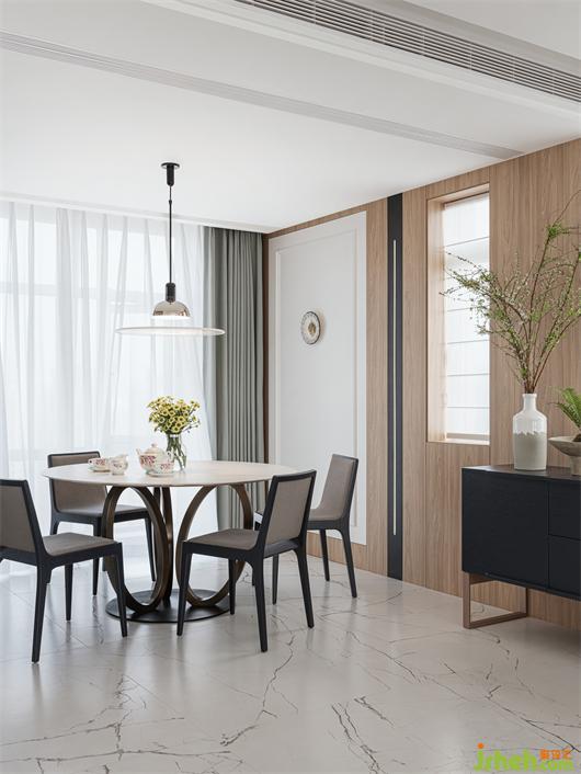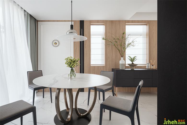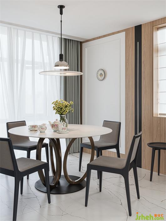 別墅裝飾設(shè)計師以藝術(shù)性裝點餐廳,在靠窗的位置選用金屬和大理石的圓形餐桌,皮革材質(zhì)的餐椅,搭配上簡潔的吊燈,低調(diào)奢華又不失舒適性,營造出愜意的就餐空間。